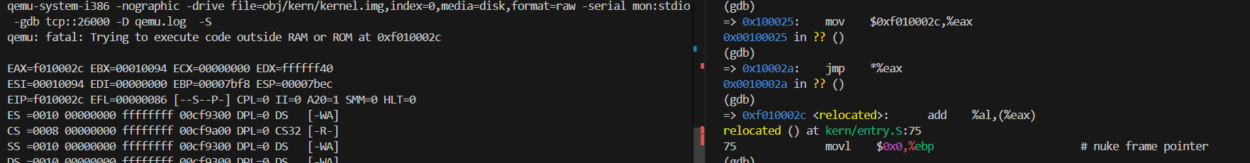 显然是我们修改了bootloader的地址,导致其编译之后VMA和LMA对不上,而ljmp这一条指令还是按照LMA的地址跳转,所以就导致了错误。